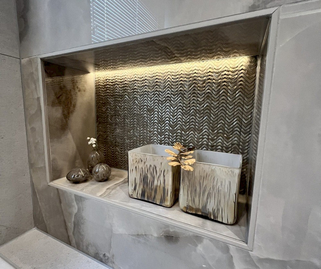 We zijn verheugd om onze nieuwste badkameroplevering met jou te delen. Deze prachtige badkamer is voorzien van groot formaat marmerlook tegels in combinatie met een rustige wandtegel, waardoor een harmonieuze sfeer ontstaat. Het maatwerkmeubel met een niskast naast de wastafel biedt niet alleen opbergruimte, maar dient ook als stijlvolle eyecatcher. Wat deze badkamer echt bijzonder maakt, zijn de gouden mozaïekaccenten in de nissen. Ze voegen een vleugje luxe en glamour toe aan de ruimte, waardoor een unieke uitstraling ontstaat. Bij Kirry begrijpen we dat elke badkamer uniek is en we bieden maatwerkoplossingen om jouw droom badkamer werkelijkheid te maken. Ontdek onze collectie groot formaat marmerlook tegels, wandtegels en prachtige mozaïeken. Creëer een oase van rust en stijl in jouw eigen badkamer.