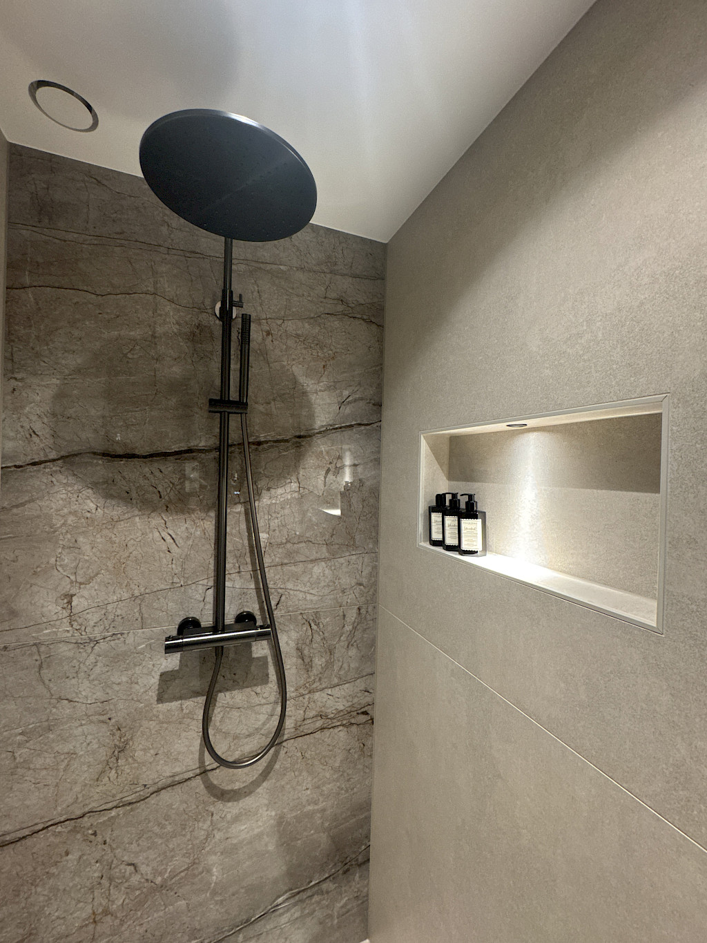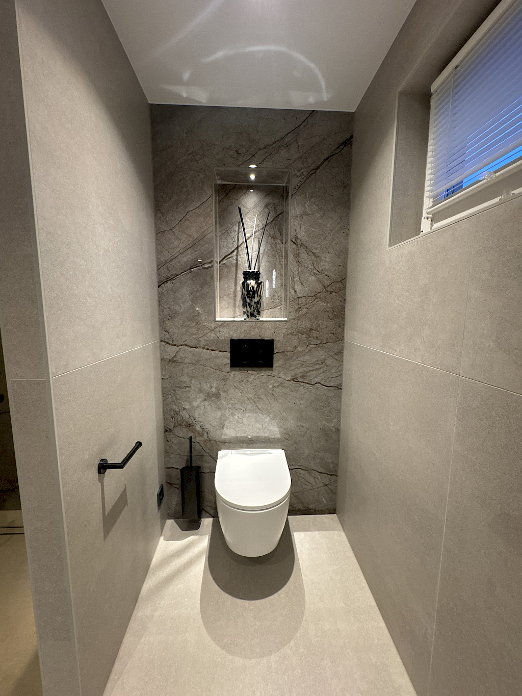 We delen graag een van onze recent opgeleverde badkamers. In deze badkamer is gekozen voor groot formaat marmerlook tegels, gecombineerd met een warme en rustige tegel. Deze combinatie zorgt voor een stijlvolle uitstraling en brengt tegelijkertijd een rustige en luxe sfeer in de ruimte.