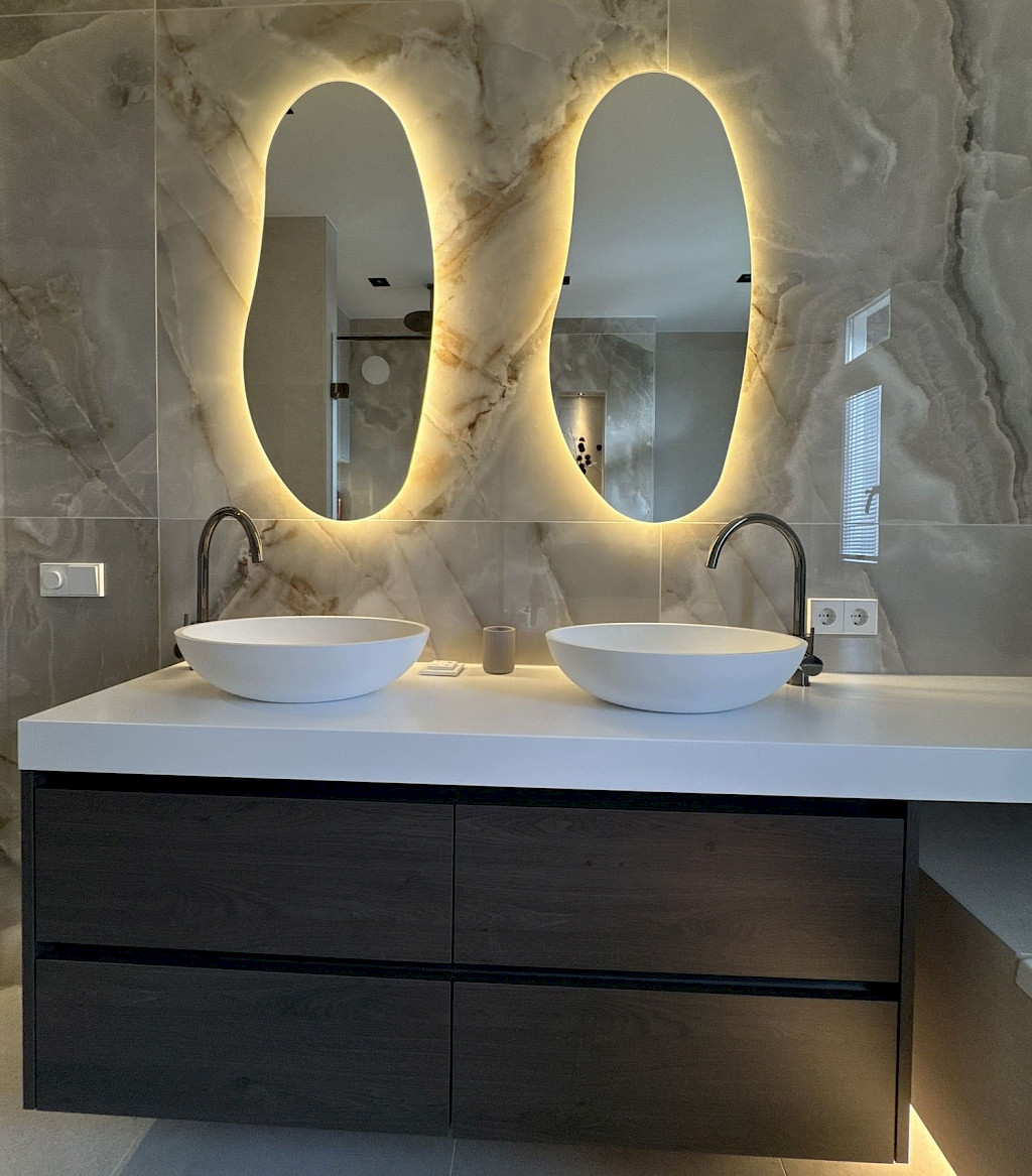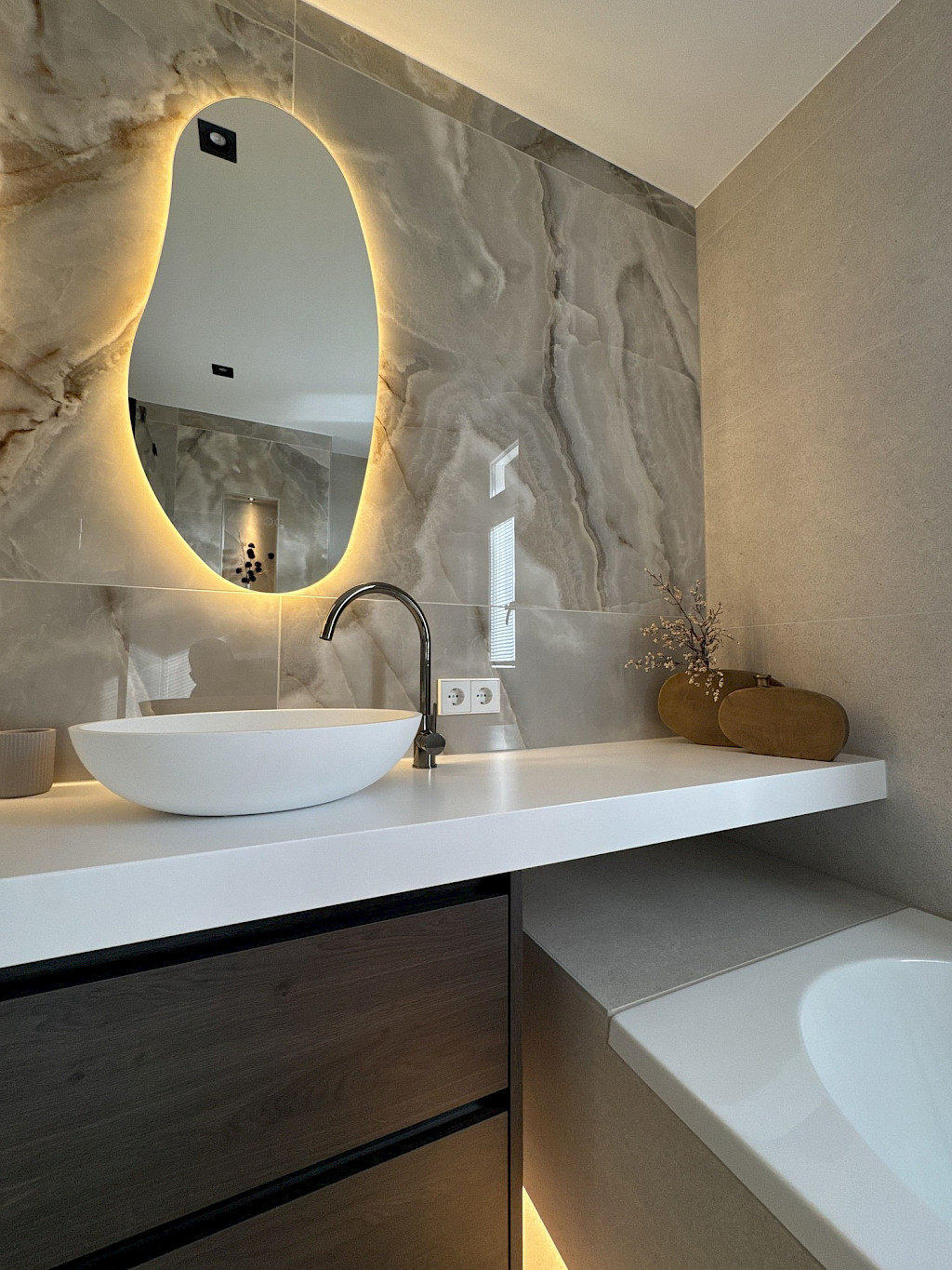 Wat direct opvalt is de harmonie: de vorm van de spiegels, het lijnenspel in het maatwerk en de doordachte lichtaccenten geven de ruimte een rustige ritmiek. Hier geen overdaad, maar een subtiele verfijning die blijft verrassen. Een plek waar design de ruimte krijgt én rust brengt.