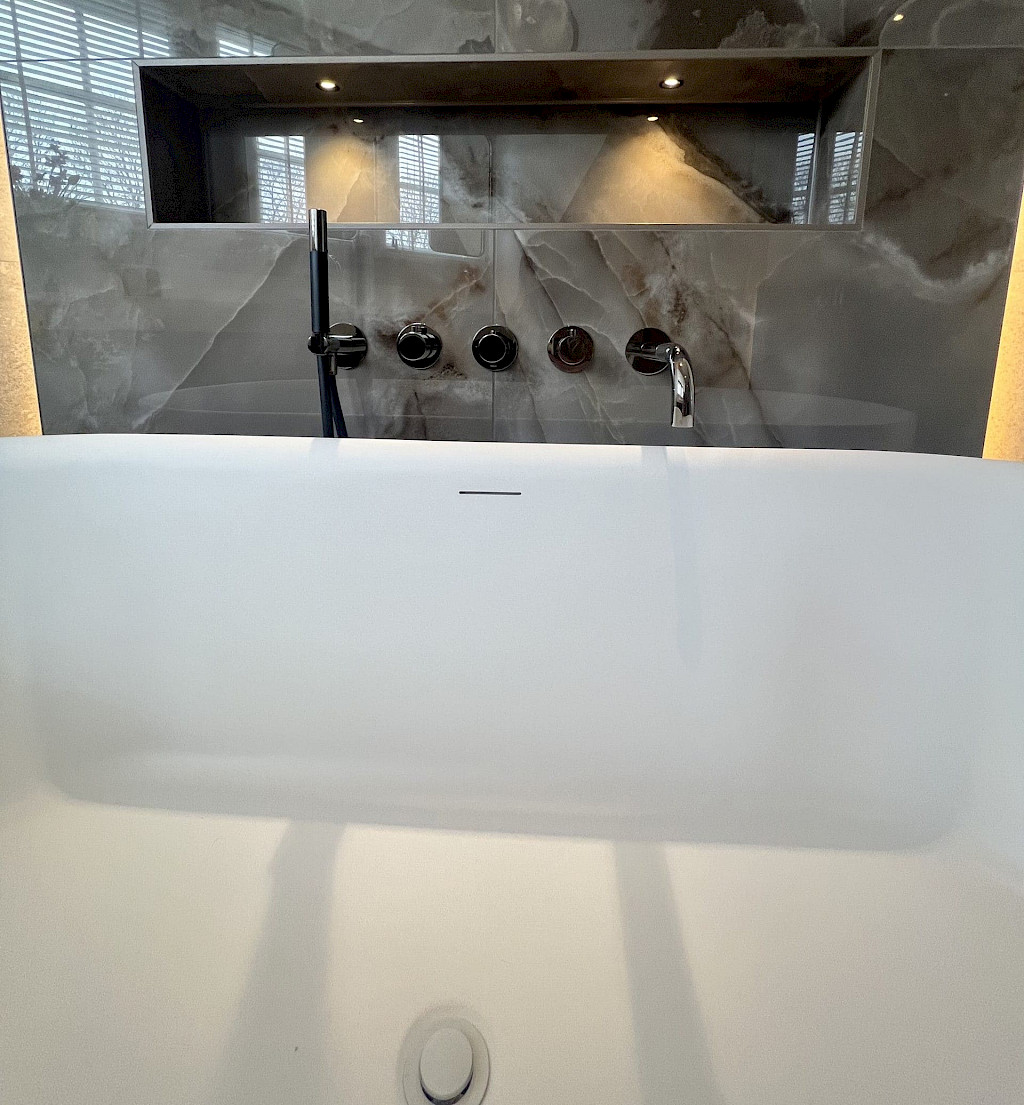 Bij binnenkomst wordt de aandacht onmiddellijk getrokken naar het vrijstaande bad, dat een gevoel van onmiskenbare verfijning en comfort uitstraalt. Dit element voegt een chique sfeer toe aan de ruimte, zonder overdreven te zijn.