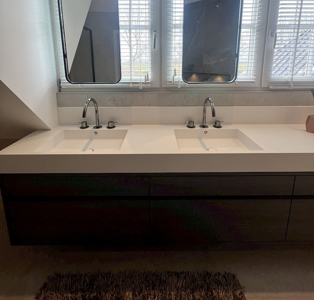 Een centraal element van deze badkamer is het indrukwekkende groot maatwerk meubel over de volledige breedte. Dit is niet enkel visueel aantrekkelijk, maar ook een slimme opslagoplossing. De maatwerk spiegels voegen een vleugje intelligentie toe, schuivend opzij om de ruimte te laten baden in natuurlijk licht.