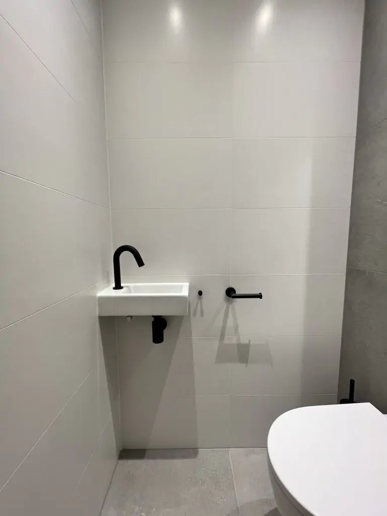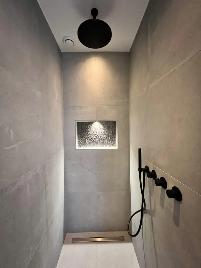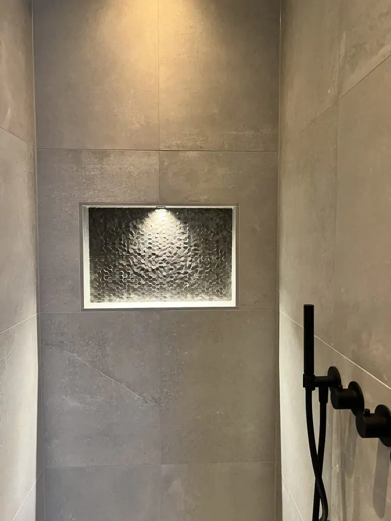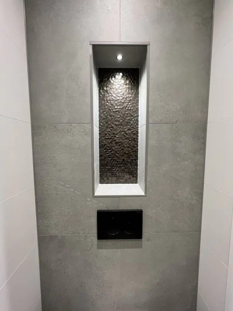 Bij Kirry zijn we trots op onze nieuwste badkamer oplevering. Deze moderne badkamer is voorzien van prachtige mozaïek tegels in de nissen en grijze tegels in de rest van de badkamer. Het opvallende kenmerk van deze badkamer zijn de zwarte kranen, die een stijlvolle en moderne uitstraling aan de ruimte geven.