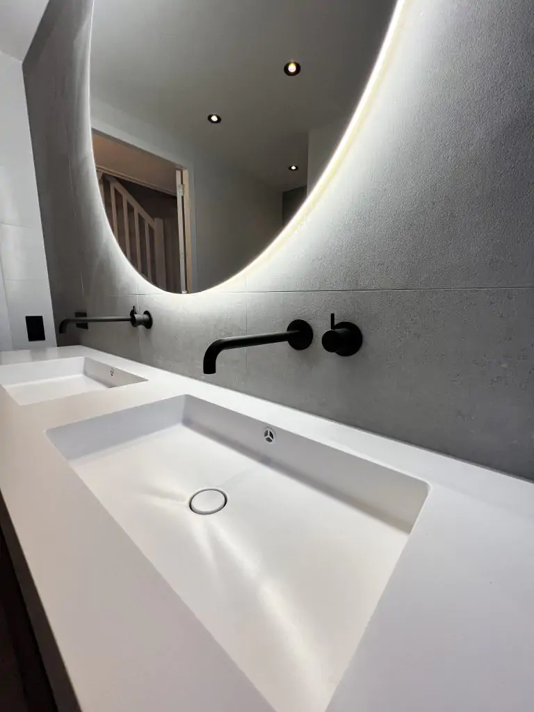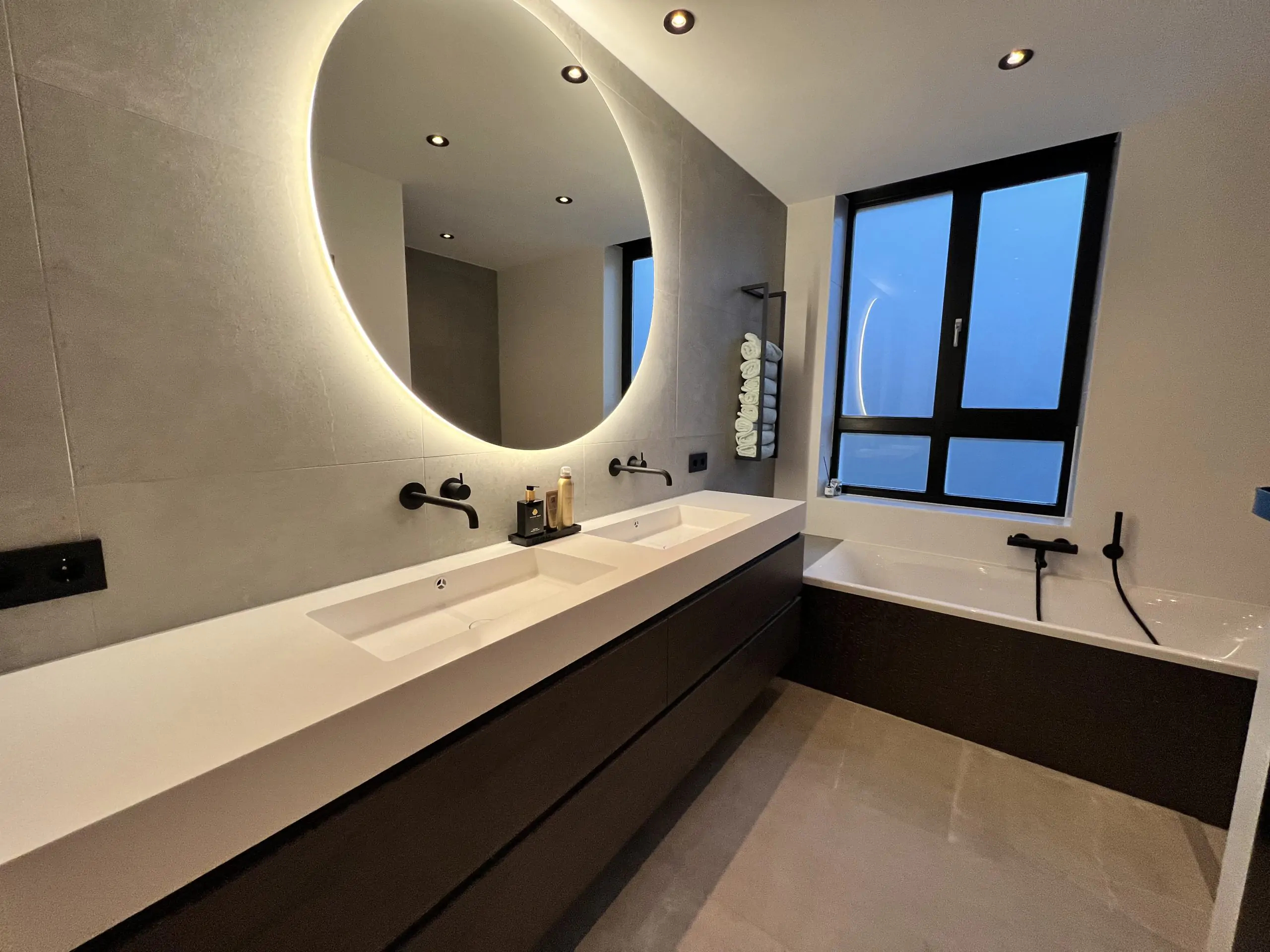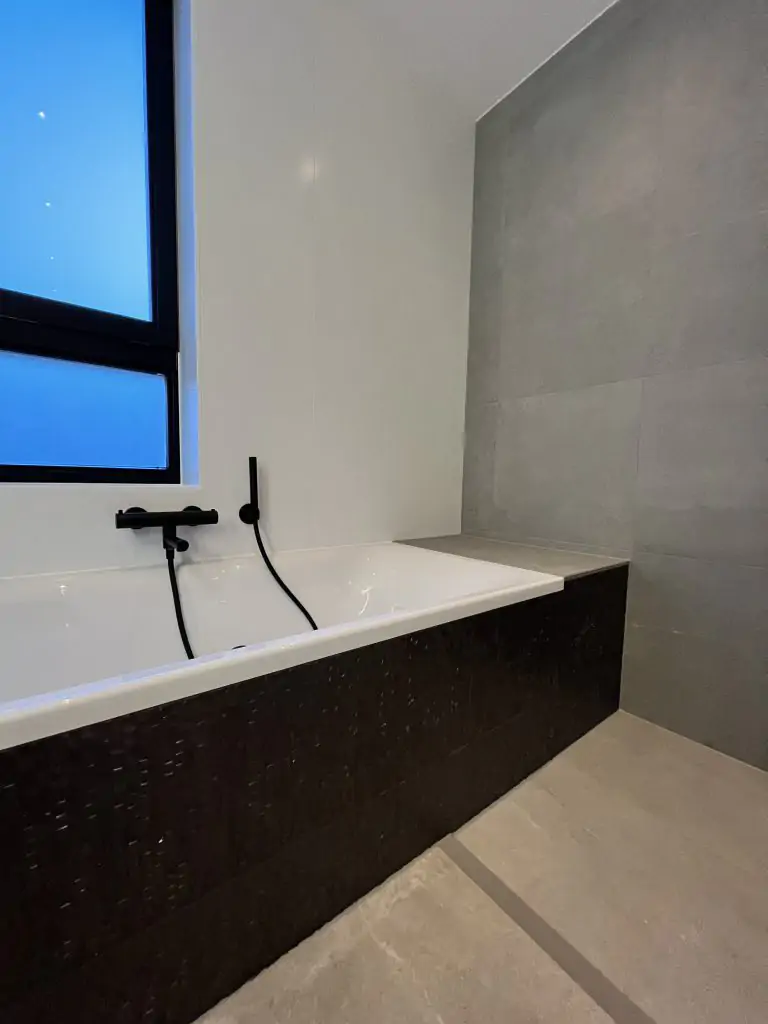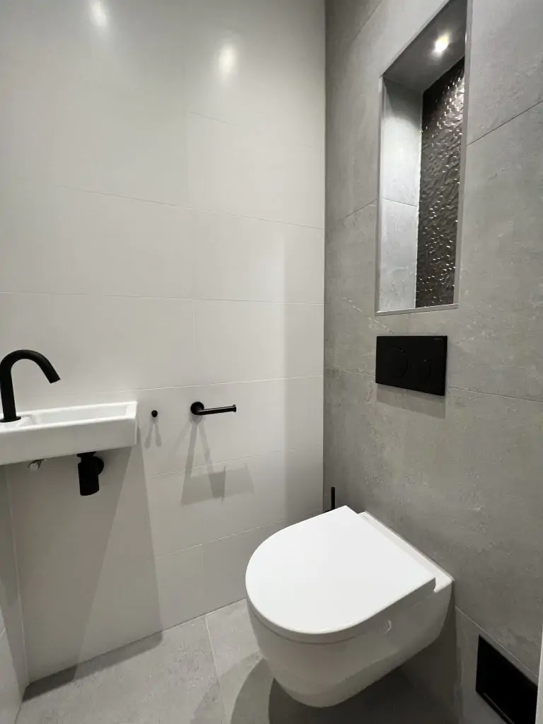 Bij Kirry zijn we trots op onze nieuwste badkamer oplevering. Deze moderne badkamer is voorzien van prachtige mozaïek tegels in de nissen en grijze tegels in de rest van de badkamer. Het opvallende kenmerk van deze badkamer zijn de zwarte kranen, die een stijlvolle en moderne uitstraling aan de ruimte geven.
