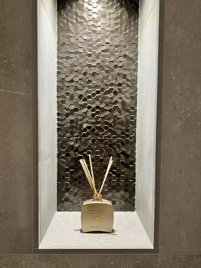 Mozaïektegels in de nissen zijn een geweldige manier om een persoonlijk accent toe te voegen aan uw badkamer. De verschillende kleuren en texturen geven de badkamer een unieke uitstraling. De grijze tegels zorgen voor een rustige en serene sfeer in de rest van de ruimte.